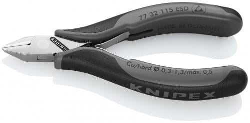 Для самых тонких работ по резке, например, в электронике и точной механике. Ручки электроотводящие с рассеянием. Устойчивый коробчатый безлюфтовый шарнир. Плоская двуперая пружина с малым трением. Финишная отделка - зеркальная полировка в сочетании с тонкой масляной пленкой обеспечивает хорошую защиту от коррозии. Режущие кромки дополнительно закалены. Ручки с двухцветными многокомпонентными чехлами серо-черного цвета. Специальная инструментальная сталь особого качества, кованая, многократно закалённая в масле. Заостренная головка, с маленькой фаской. Твердость режущих кромок примерно 60 HRC.