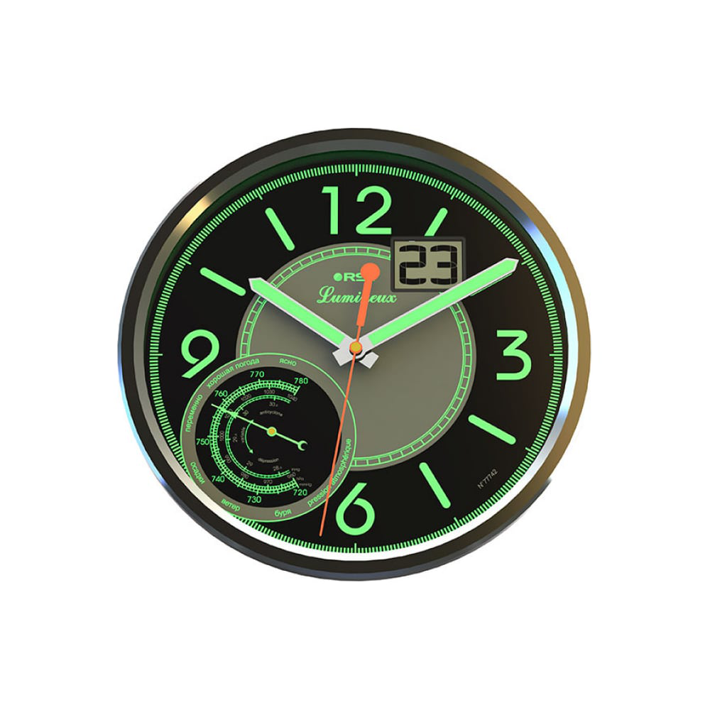 Часы-метеостанция RST, часы, дата, барометр RST77742 представляют собой уникальные настенные часы со светящимися в темноте стрелками и циферблатом серии Lumineux. Корпус диаметром 29 сантиметров обрамлен металлическим кольцом с лазерной обработкой поверхности. Часы отличаются плавным и бесшумным ходом стрелок, которые продолжительное время видны в темноте. На дисплее метеостанции расположен барометр, измеряющий атмосферное давление. Питание механизма часов осуществляется от одной батареи АА 1,5 В. На черном циферблате контрастно выделяются яркие элементы дизайна.