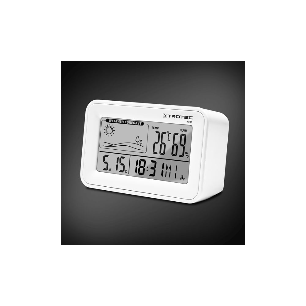 Цифровой будильник с метеостанцией TROTEC BZ01 3510205000 имеет соответствующее большое разнообразие функций. На задней панели находится панель управления, четко оформленная с четырьмя кнопками. Его можно использовать как в качестве стенда, так и в качестве настенного устройства. Кронштейн для настенного монтажа уже вставлен в заднюю часть прибора. Для питания достаточно батареи ААА 1.5 В, входящей в комплект поставки. Адаптер питания не требуется. Желаемое время будильника можно установить в режиме будильника. В представлении календаря вместо времени постоянно отображается текущий год. На цифровом ЖК-дисплее вы одновременно получаете функцию будильника, отображение времени и даты, контроль климата в помещении и тенденцию погоды.