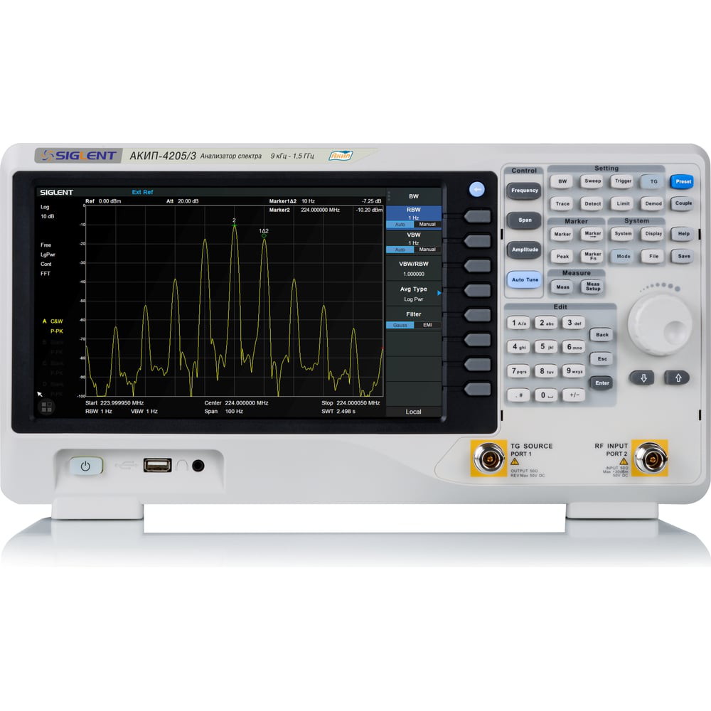 Анализатор спектра АКИП 4205/3 используется для измерения и визуализации спектра сигнала. Работает в полосе частот от 9 кГц до 1.5 ГГц. Модель отличается простым и интуитивно понятным интерфейсом. Спектральные кривые поддерживают цветовое разделение на экране, что помогает легко идентифицировать соответствующие спектры в случае изменения различных параметров. Наличие USB-кабеля позволяет подключаться к ПК для дистанционного управления или передачи данных.