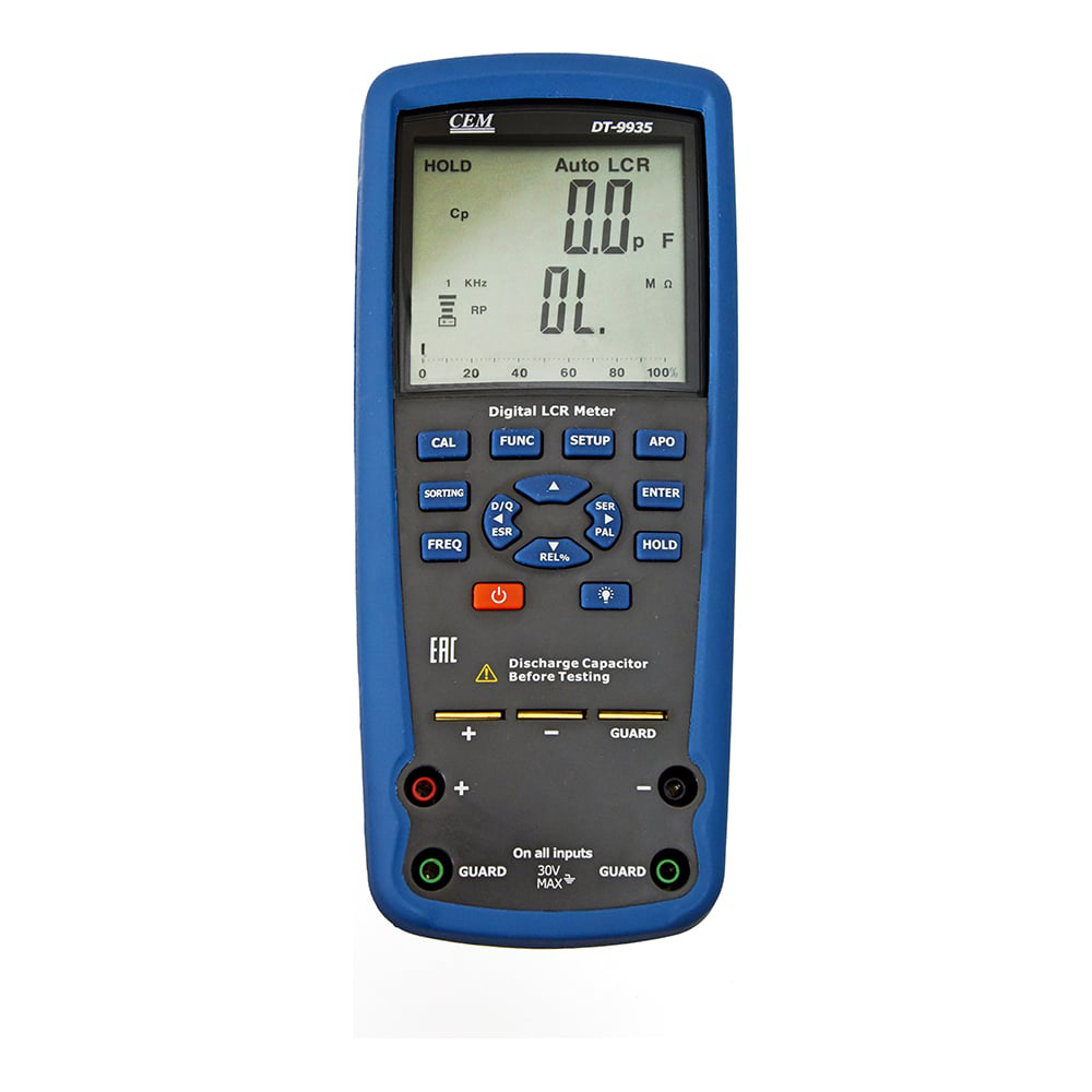 Профессиональный LCR-метр с автоматическим выбором режима измерений СЕМ DT-9935 481097 - это точный специализированный прибор с четырехпроводной схемой измерения. 5 вариантов частоты тестирования (100 Гц, 120 Гц, 1000 Гц, 10000 Гц и 100000 Гц) позволяют проводить полную диагностику оборудования. Напряжение измерения составляет 0.6 В. Ударопрочный корпус с резиновыми вставками гарантирует долгий срок службы модели.