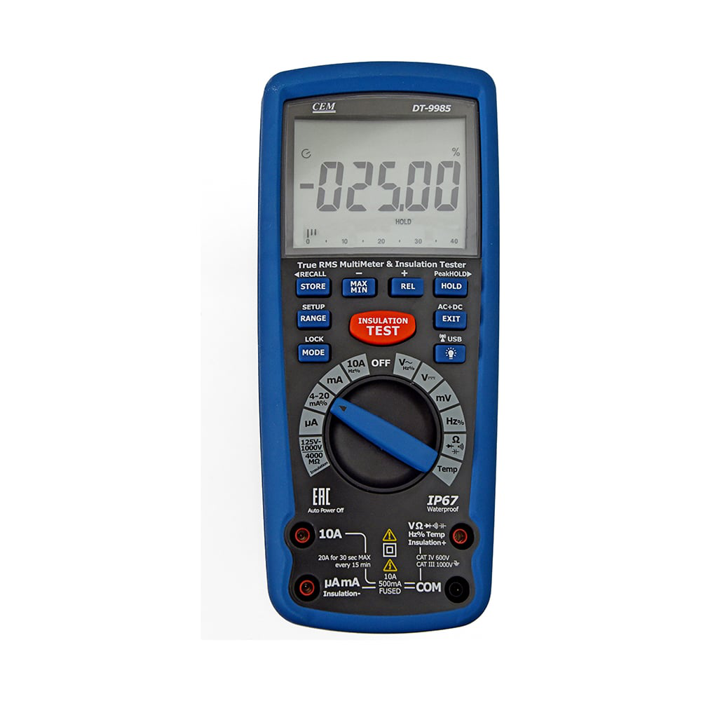 Измеритель сопротивления изоляции с True RMS мультиметром СЕМ DT-9985 481127 имеет прочный водонепроницаемый корпус, который соответствует степени защиты IP67. Благодаря защите от перегрузок по стандартам CATIII 1000V и CATIV 600V модель отличается безопасностью применения. Для измерения температуры в комплект поставки входит термопара типа К.