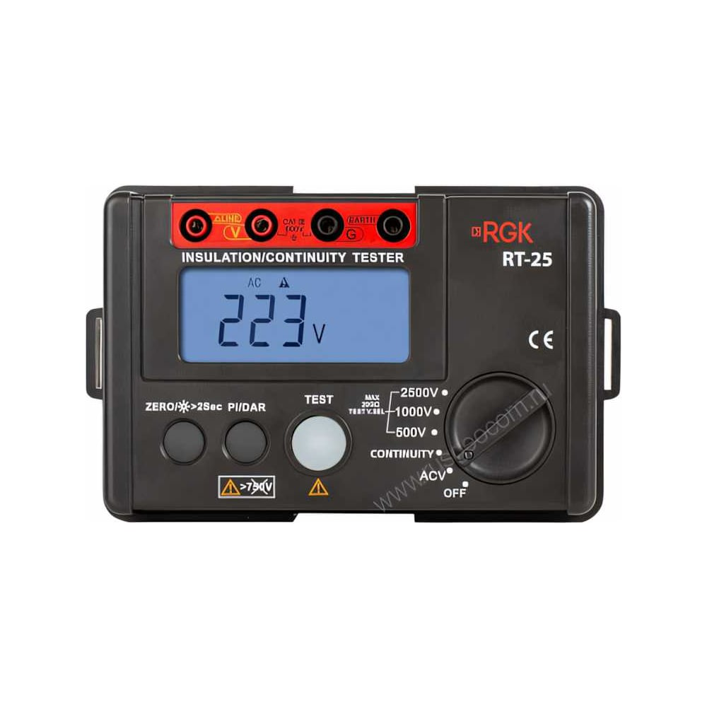 Мегаомметр RGK RT-25 с поверкой 779708 используется для оценки качества изоляции при проведении диагностики и ремонта электронного оборудования, элементов энергосистем, трансформаторов, электродвигателей. Этот прибор гораздо точнее, чем мультиметр. Он может локализовать участки изоляции, утратившие свои первоначальные свойства, или механические повреждения и определить масштаб проблемы. Проверки неразрушающим методом не требуют долгой приостановки работы объекта и нарушения целостности проводников. Особенности модели Рабочий диапазон 0,00 МОм ~ 20,00 ГОм при точности от ±3% Выбор тестового напряжения: 500, 1000, или 2500 В Расчет индекса поляризации и коэффициента абсорбции Режим постоянного измерения Функция прозвонки цепи до 200 Ом Экран с подсветкой и индикацией до 1999 Категория измерений CAT III 600В