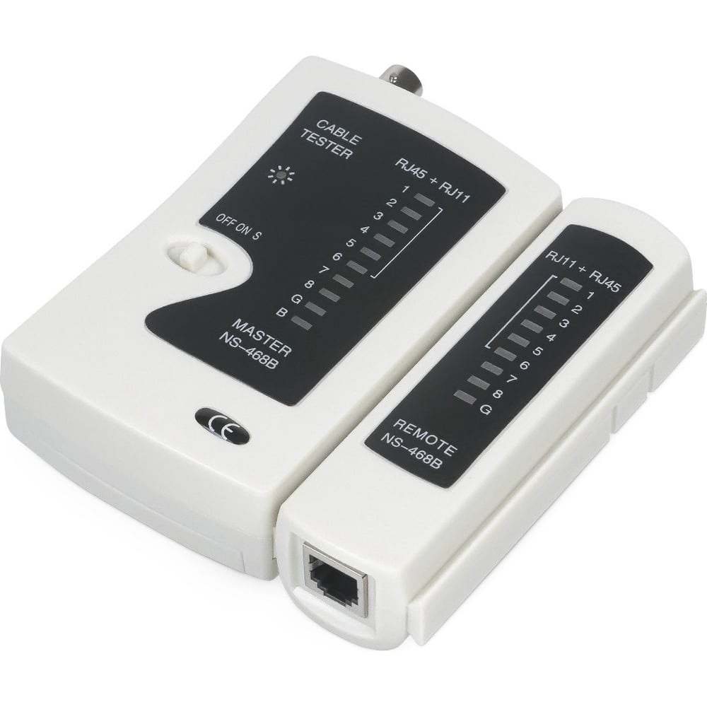 Прибор состоит из двух частей – основного блока и удаленного модуля. Удаленный модуль можно отсоединить для тестирования кабелей большой длины или тестирования линии. Основной блок имеет 3 порта: RJ45 (8P8C), RJ11/RJ12 (6P6C) и порт BNC. Удаленный модуль имеет 2 порта: RJ45 (8P8C) и RJ11/RJ12 (6P6C). Также в комплект входит удаленный терминатор BNC для тестирования коаксиального кабеля с разъемами BNC. Простое и легкое использование. Светодиодная индикация.