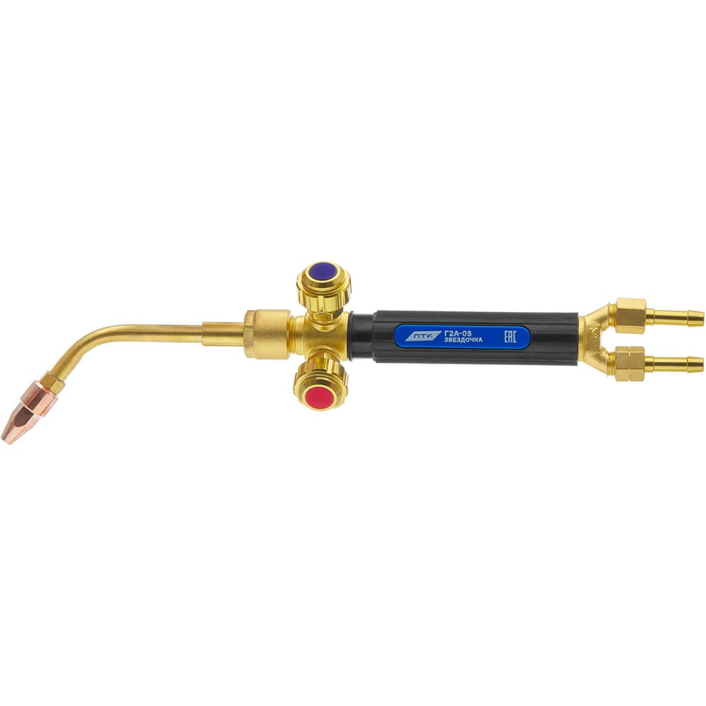 Горелка ацетиленовая Г2А-05 «Звездочка» (№ 0А, 1А, 2А, 3А) используется для сварки, пайки высокотемпературными припоями, нагрева, плавления и прочих видов газопламенной обработки металлов. На горелке установлена ручка из высокотемпературного штампованного пластика, выдерживающая температуру до 200 С, благодаря чему можно работать в тонких рукавицах. Горелка Г2А-05 укомплектована латунным сварочным наконечником с медными мундштуками, которые позволяют сваривать металлы разных толщин. Точная регулировка мощности пламени в пределах одного наконечника производится вентилями, ступенчатое изменение – сменой наконечников. Давление газа на входе и расход зависит от установленного наконечника. В руководстве по эксплуатации указаны ориентировочные данные. Маркировка медных мундштуков и толщина свариваемого металла: №0А (0,2–0,5 мм) №1А (0,5–1,0 мм) №2А (1,0–2,0 мм) №3А (2,0–4,0 мм)