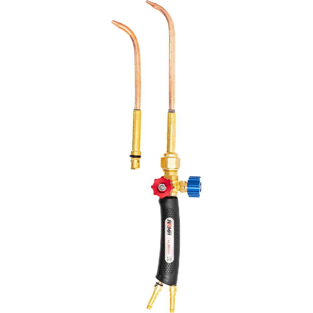 Инжекторная горелка для сварки металлов толщиной до 5,0 мм. Медные цельнотянутые наконечники № 2П и 3П. На горелке установлена ручка из высокотемпературного штампованного пластика, выдерживающая температуру до 200°С, позволяет работать в тонких рукавицах. Точная регулировка мощности пламени в пределах одного наконечника производится вентилями, ступенчатое изменение — сменой наконечников. Давление газа на входе и расход зависит от установленного наконечника. В руководстве по эксплуатации указаны ориентировочные данные. Особенности пропановой горелки ГЗУ МИНИ (№ 2П, 3П): Горелка обладает компактными размерами и облегченной конструкцией. Материал наконечников - медная цельнотянутая трубка. Обеспечивает большую продолжительность работы без перегрева за счет улучшенного теплоотвода. Конструктивная особенность коротких загнутых «носиков» в каждом наконечнике позволяет производить сварочные работы в очень стесненных условиях, производить угловые швы. Горелка укомплектована ниппелями, что позволяет использовать резинотканевые рукава с внутренним диаметром 6 мм без дополнительных переходников, накидными гайками M12х1,25 для подачи кислорода и M12х1,25LH для подачи пропана. Технические характеристики: Применяемый горючий газ:Пропан Толщина свариваемого металла, мм:до 5 Давление кислорода на входе, МПА (кгс/см²):2,5–4,5 Давление пропана на входе, МПА (кгс/см²):0,3–1,0 Расход кислорода, м³/ч:0,25–1,7 Расход пропана, м³/ч:0,25–0,55